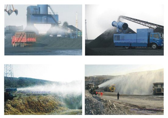 風(fēng)送式遠程地面噴霧降塵系統利用高峰壓,大流量專(zhuān)用軸流風(fēng)機驅動(dòng),通過(guò)導流風(fēng)筒,形成高速氣流,撞擊破碎安裝在風(fēng)筒出口的噴嘴,形成霧化粒度高(100um)射程遠(100米),指向性強的霧流。